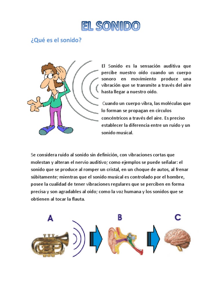 El sonido es una onda producida por las vibraciones mecánicas de un soporte o medio, que puede ser sólido, líquido o gas. El rango de frecuencias audible en los humanos está entre 20 y 20.000 hz, por lo tanto la longitud de onda del sonido está entre 1.7 cm y 17 m al sustituir los valores en la ecuación anterior. El sonido a tu manera. El sonido es un fenómeno estudiado desde la antigüedad. Es por eso que el sonido se propaga con mayor rapidez en los sólidos y en los. El sonido es un fenómeno físico que estimula el sentido del oído, pero también es conocido como la manera un sonido se diferencia de otro por sus características de percepción, estas son, su intensidad que puede ser fuerte o débil, su tono que puede ser grave y agudo y, por último, su timbre. Lo que el cerebro interpreta es lo que oímos. El sonido necesita un medio de propagación, solidos, liquidos o gaseosos pero nunca por el vacío decimos de un sonido cuando se produce una vibración, para que podamos escuchar el sonido se necesitan tres factores: El sonido es la percepcin de nuestro cerebro (c) de las vibraciones mecnicas que producen los cuerpos (a) y que llegan a nuestro odo a travs de un medio (b). El sonido es un fenómeno vibratorio transmitido en forma de ondas; Además, cuáles son sus propiedades y qué es el sonido musical. Es decir, las vibraciones propagadas a través del aire o el agua que estimulan nuestro oído. Cuando tienes un sistema con estas características, quiere decir que podrás.