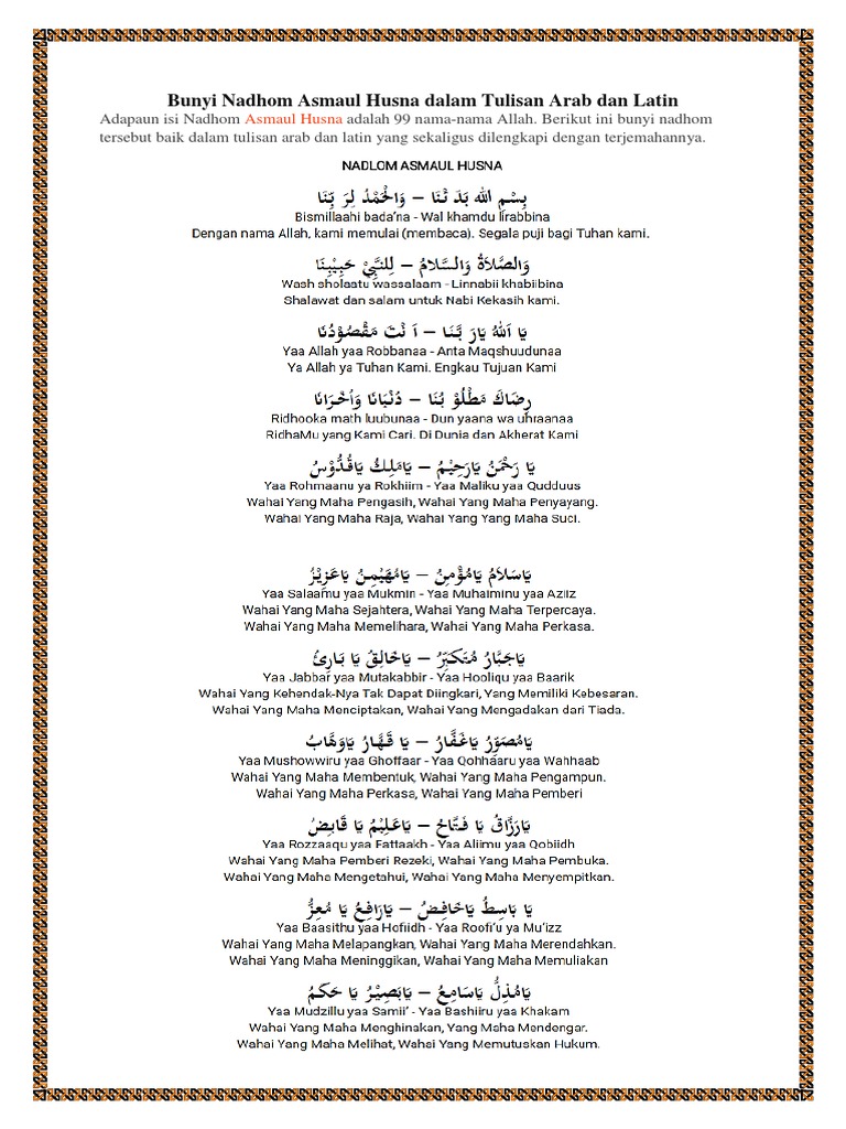 Kumpulan asmaul husna arab, latin dan artinya lengkap, beserta penjelasan setiap asmaul husna dan nadhom asmaul husna, doa asmaul asmaul husna ini berasal dari bahasa arab, sesuai dengan asal mula agama islam yang berasal dari wilayah arab dan juga kitab suci agama islam yang.